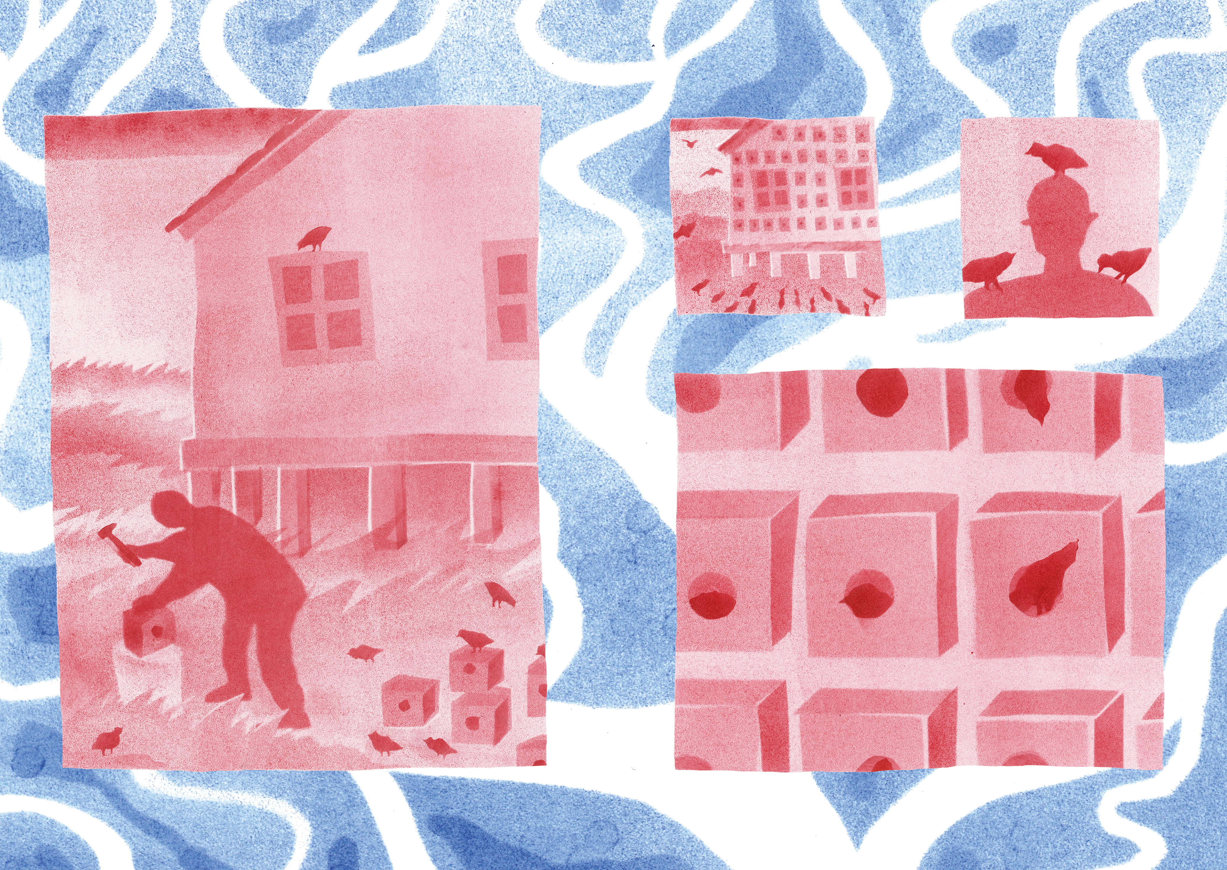 This silent book was my Final Major Project at BHSAD BA Illustration course. It is a collection of short silent comics about the mysterious red birds flying through different landscapes and worlds, and about the people and things they encounter on their travels.